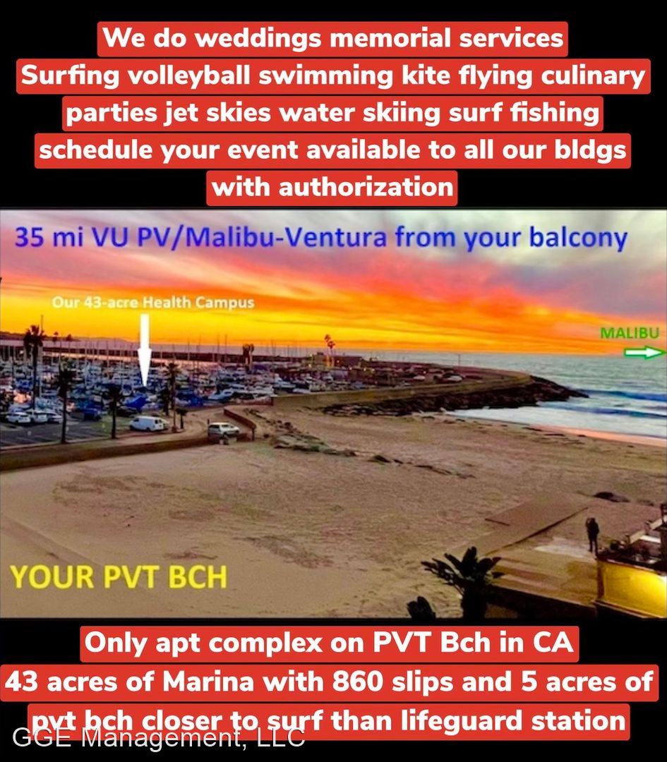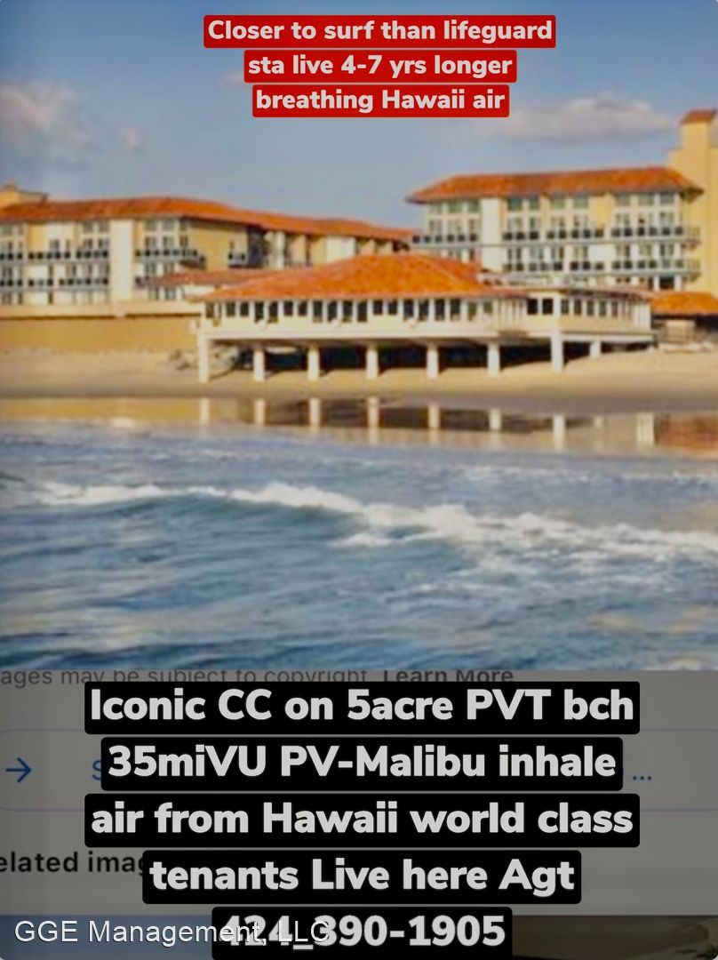 Call Matt at 424-390-1905 or 310-376-8868 - This is our flagship building: Here at Crystal Cove life at our beach is a rare privilege for those questing for the healthiest lifestyle in LA County. Welcome to whitewater paradise. Breathe air from Hawaii before it gusts to LA(smog capital of USA) live 3-5 yrs longer inhaling healthy air. Quality of life improved immensely if you have hay fever, asthma, allergy, and emphysema.CA rated#1 beach bike path. Every bldg has been earthquake Retrofit or has huge amounts of steel and concrete dedicated to the parking structures which diminishes the risk to life and property during a CA earthquake. Crystal Cove at 18 feet to the surf is closer to water than the lifeguard station. In fact, it's closer to the surf than any apartment complex in all of Southern California. With 35-mile views of Santa Monica Bay from the red tile roofs of Palos Verdes to the Malibu Colony and on to Ventura, It commands the beach scene from Torrance to Redondo Beach, Hermosa Beach, Manhattan Beach, El Segundo and is endowed with two private beaches (North and South) where weddings and catered events take place. Many residents have commented that It is a privilege to reside at Crystal Cove Apartments. Additionally, the Chart House Restaurant is attached to our complex for whitewater dining. Pods of Whales and Dolphins are seen daily while Hawks, pelicans, sea gulls and Falcons ply the skies above. Beach hot spots are everywhere to be found with celebrities in evidence from their nearby designer condos and homes. CA lifestyle is alive well and thriving. Join in and live the healthy CA beach life. Four challenging golf courses including Trump National are in the immediate vicinity. Our formerly dark and dingy parking have become palaces with the installation of state of the art emergency LED lighting lending safety in getting from your door to your car at nighttime. With the electrical grid predicted to be down more often ladies have commented on how they appreciate the safety at night especially wearing high heels. Solar energy panels are installed to take advantage of renewable energy and do our part in diminishing global warming. This year CC is off fossil fuel in favor of solar energy. Congratulations ! Private Beach available by request. EQUAL HOUSING OPPORTUNITY: Our housing is available to everyone regardless of familial status, sex, handicap, race, color, religion or national origin. DISCLAIMER: We are not responsible for the accuracy of information contained in these ads. Although we try to avoid errors we are not responsible for any mistakes in pricing, features or terms. Please call the leasing department to confirm information and availability. RATES ARE SUBJECT TO CHANGE WITHOUT NOTICE. All Rates herein are intended for use by walk-in applicants only. If you have a Broker or Realtor that you are working with then you must contact your agent for Rates which they can find using the Multiple Listing Service (MLS).