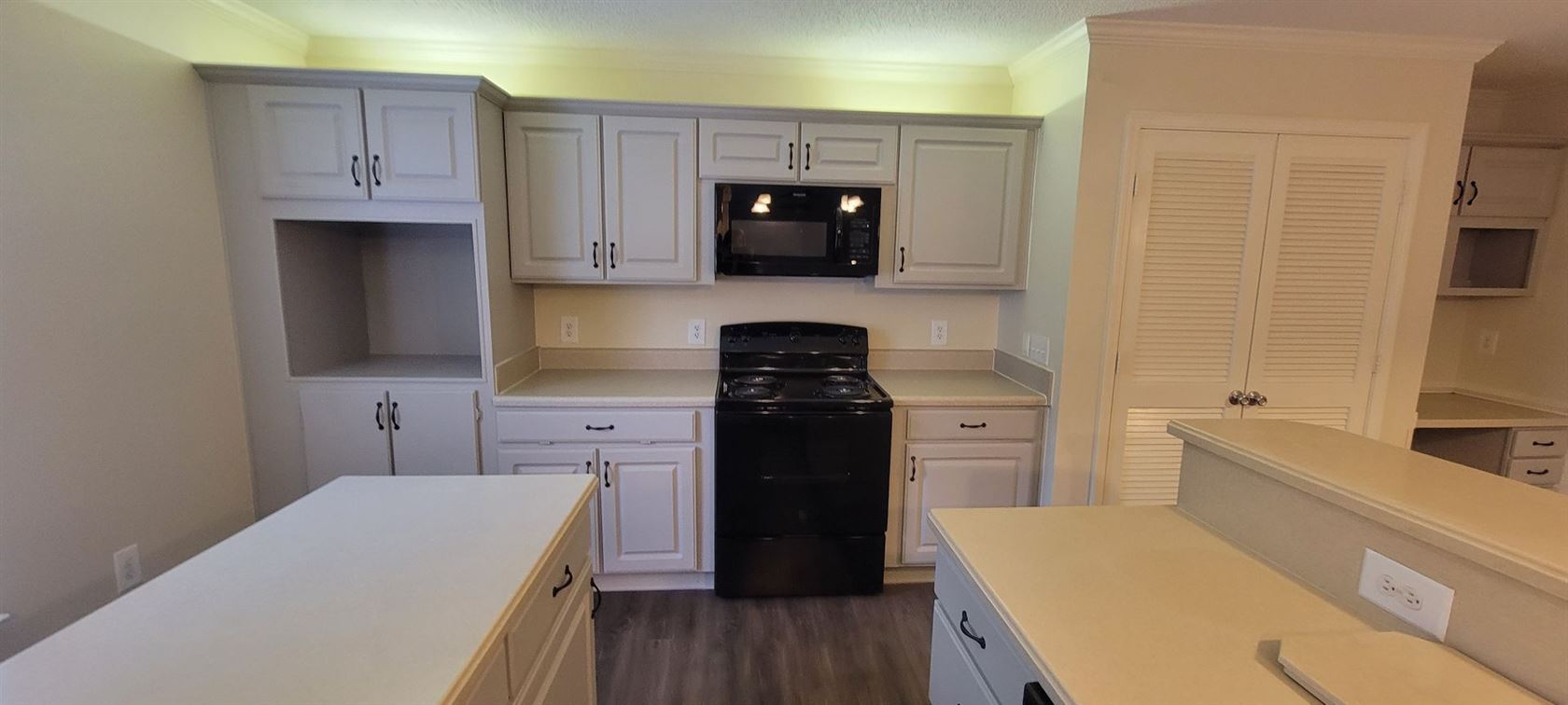 You will be able to cook and serve from the kitchen to living room with no problems thanks to your counter-bar. Plus tons of cabinet and counter space.
